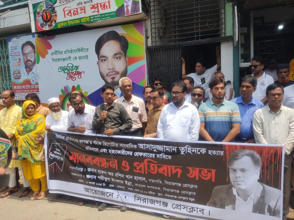 গাজীপুরের সাংবাদিক দৈনিক প্রতিদিনের কাগজের স্টাফ রিপোর্টার আসাদুজ্জামান তুহিন হত্যাকান্ডের প্রতিবাদে ও খুনীদের দ্রুত বিচার করে দৃষ্টান্তমূলক শাস্তির দাবীতে সিরাজগঞ্জে প্রেসক্লাবের উদোগে মানববন্ধন ও প্রতিবাদ সমাবেশ অনুষ্ঠিত হয়েছে। সোমবার (